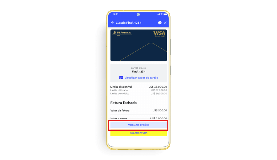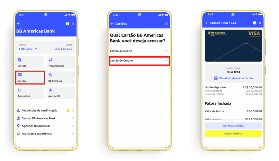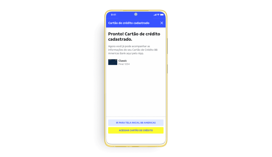 a. No primeiro acesso ao Cartão de Crédito BB Americas Bank no App BB SA, você deverá cadastrar o cartão de crédito que deseja acessar.