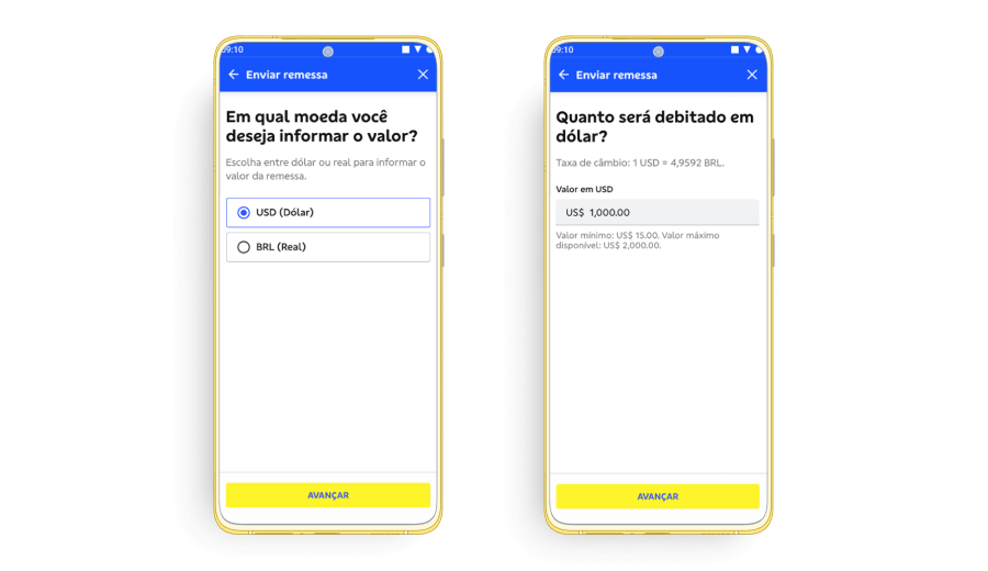 4. Informe o valor que será enviado em dólar ou recebido em reais, de acordo com os valores mínimos e máximos permitidos.