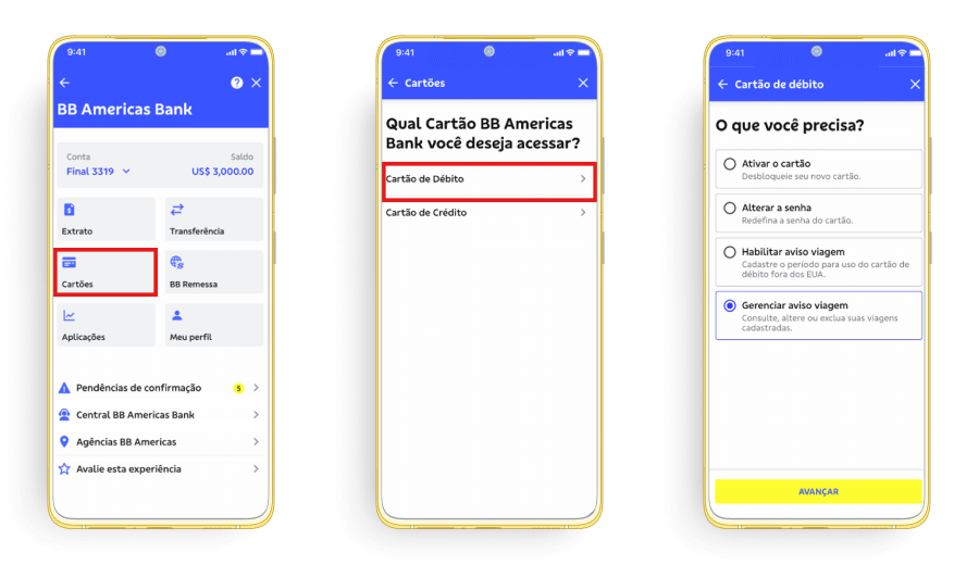 2. Clique em “Cartões” > “Cartão de Débito” e selecione “Gerenciar aviso viagem”.
