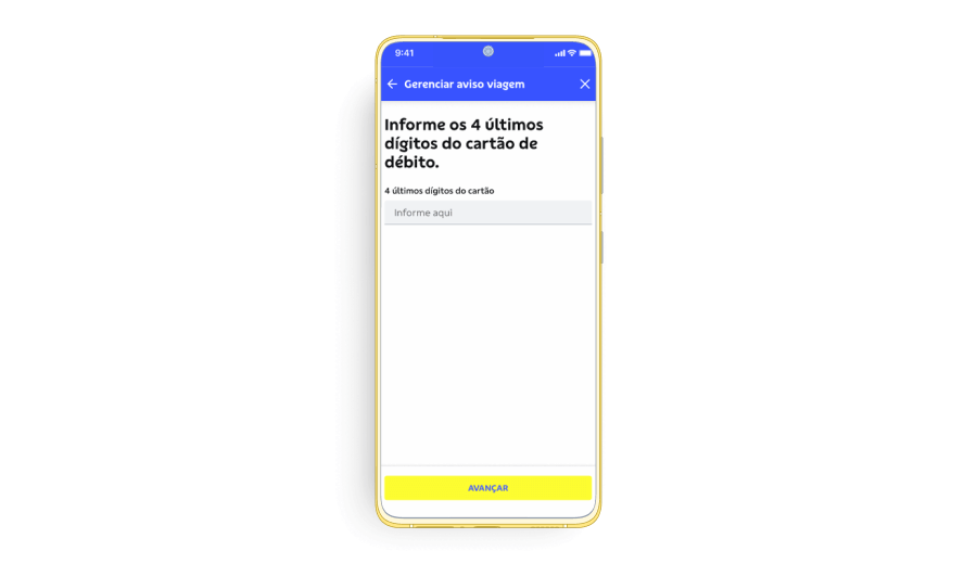 3. Informe os 4 últimos dígitos do cartão de débito o qual deseja gerenciar o aviso viagem.
