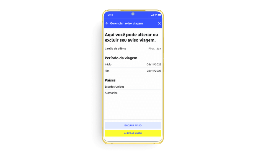 4. Selecione se deseja excluir ou alterar o aviso viagem.
