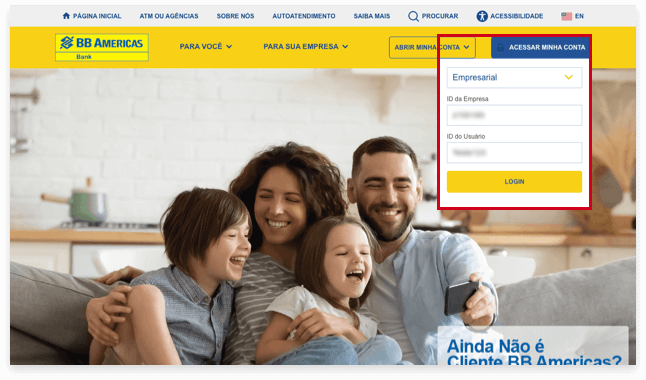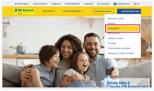 1. Acesse o website do BB Americas Bank, clique em Acessar Minha Conta e selecione a opção Empresarial.