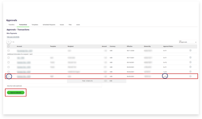 Atenção: Se o acesso da sua empresa foi configurado com níveis de autorização, todas as aprovações necessárias devem ser realizadas para iniciar o processamento da Wire. Para aprovação, basta que o usuário com permissão de aprovação acesse a opção approvals na página inicial de acesso do Business Online Banking e selecione transactions para visualizar e aprovar as wires pendentes de aprovação.