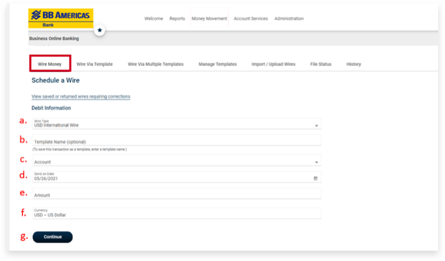 4. No menu principal, selecione Money Movement e clique em Wire.