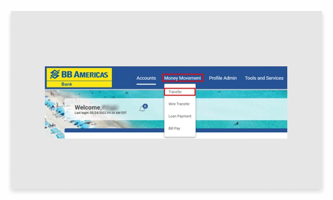 2. No menu superior, selecione Money Movement e escolha a opção Transfer.