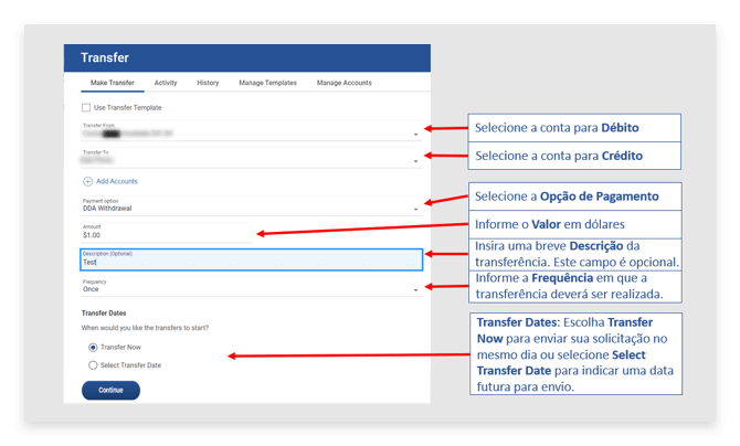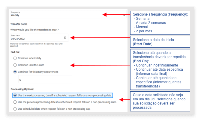 Nota: Para cadastrar uma transferência recorrente é necessário preencher os seguintes campos: Frequency informando a frequência em que a transferência deverá ser repetida, Start Date informando a data inicial da transferência e End On informando até quando a transferência deverá ser repetida.