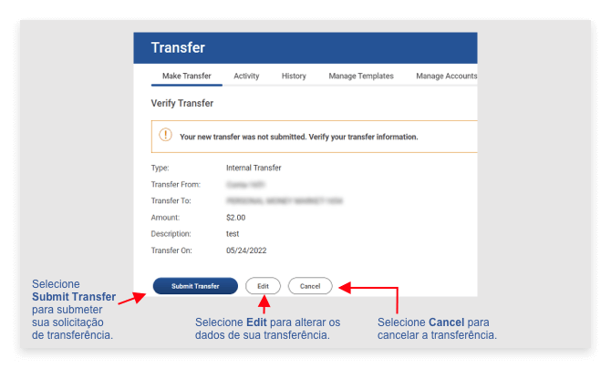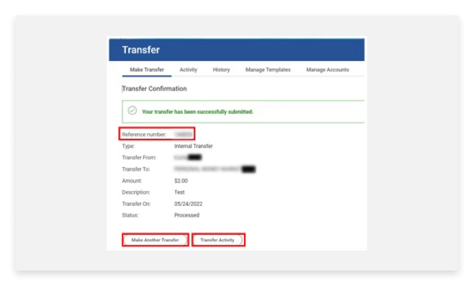 5. Após selecionar Submit Transfer, sua transferência será realizada e você receberá um número de confirmação. Para realizar uma nova transferência, selecione Make Another Transfer.