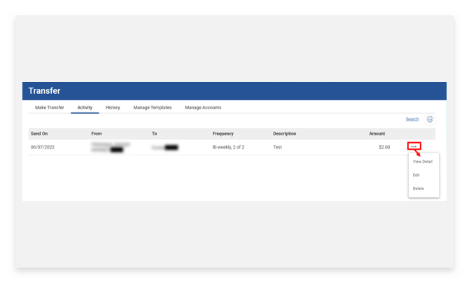 6. Caso tenha transferências recorrentes cadastradas Recurring Transaction, selecione a opção Transfer Activity para consultar, editar ou cancelar transferências recorrentes.