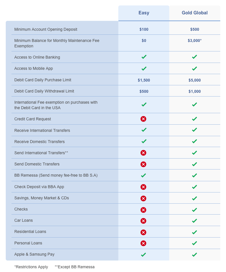 ¹This account only offers e-statements. This account offers Online Banking. This account does not offer access to some Online Banking tools (BILL PAY). Outgoing wire transfers can be conducted through the Online Banking. The opening deposit must originate from an account of same ownership with Banco do Brasil S.A.. Opening deposits from other financial institutions will not be accepted. Your account opening request will be canceled, and the amount received will be returned within 10 business days if it comes from any financial institution other than Banco do Brasil S.A. or from an account with a different account holder. A return fee of $15 will be applied, and additional charges may apply for international transfer from the issuing bank, as well as the exchange rate in effect at the time of the return.