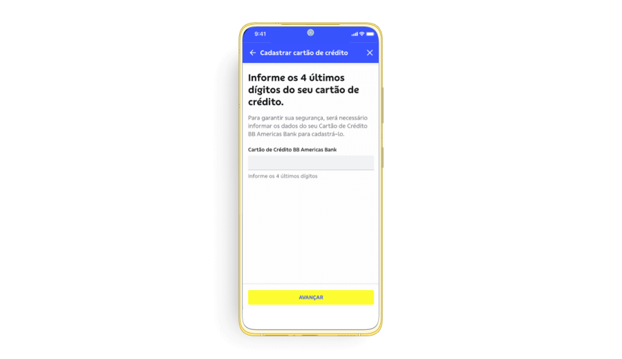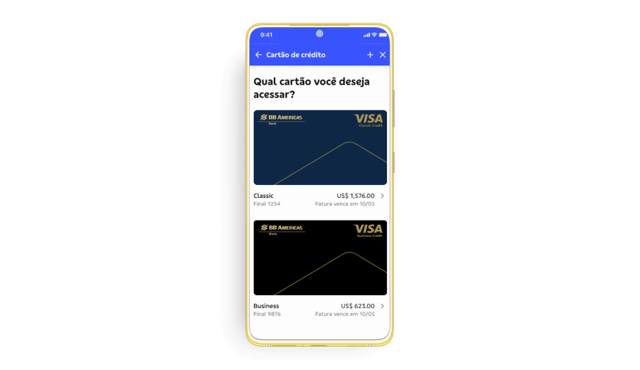 a. On your first access to the BB Americas Bank Credit Card in the BB S.A. App, you must first register the credit card you wish to view.