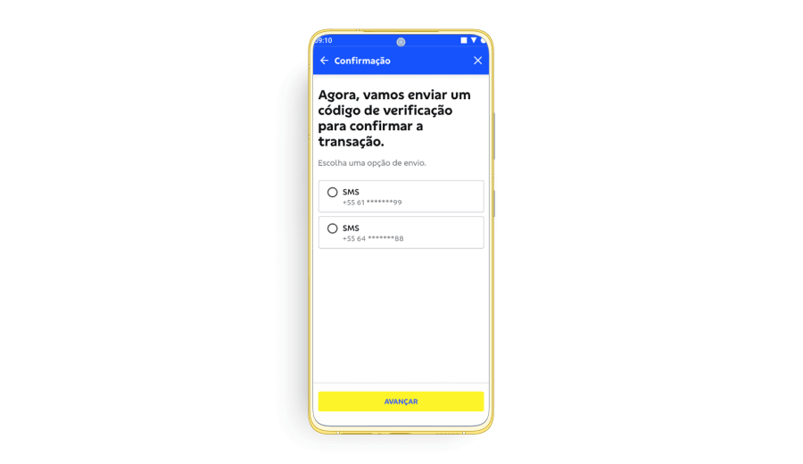 8. Select the previously registered phone number for which you wish to receive the verification code then, click on “Avançar”. If you don’t recognize the listed phone numbers, contact our BB Americas Bank Client Support Center.