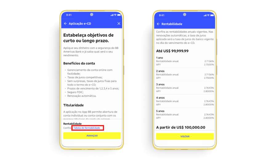 a. Click on “Tabela de Rentabilidade” para consultar as taxas de juros atuais de acordo com o valor e o prazo da aplicação financeira e-CD.