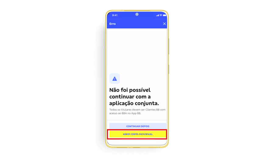 a. All account holders of the account of origin must have access to BBA in the BB S.A. App to open the e-CD Account in the BB App. Otherwise, only the opening of an individual account will be allowed.