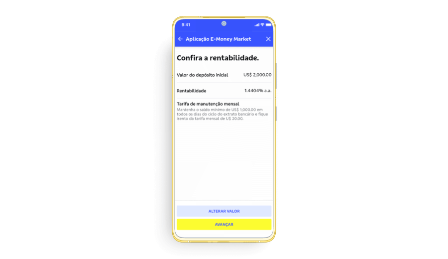 7. Inform the amount of the initial deposit to open the e-Money Market Account and click on “Avançar”.