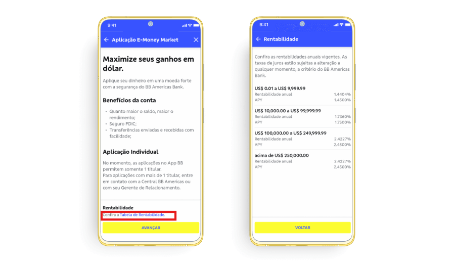 a. Click on “Tabela de Rentabilidade” to review the current interest rates according to the balance of the e-Money Market.