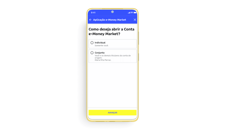 a. All account holders of the account of origin must have access to BBA in the BB S.A. App to open the e-Money Market Account in the BB App. Otherwise, only the opening of an individual account will be allowed.