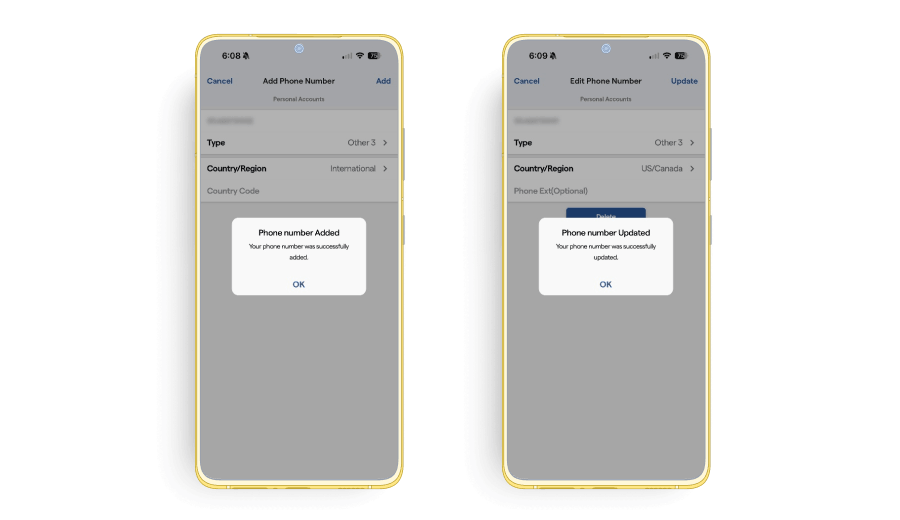 6. If you choose to update a phone number, the current phone number registered in the system will appear on the screen. If you are adding a new phone number, the field will appear blank. Enter the new phone number, choose the type, and fill in the country code if it is an international phone number.