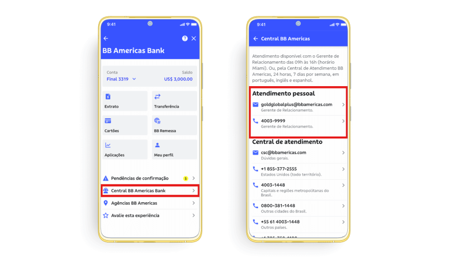 2. Click on “Central BB Americas Bank” and choose your preferred contact method.
