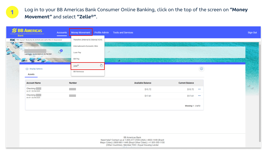 ¹Zelle® is available in the BB Americas Bank Personal Mobile App and Consumer Online Banking. To access the BB Americas Bank Personal Mobile App you must have a smartphone with access to the Android or Apple Store. Mobile messages and data rates may apply.