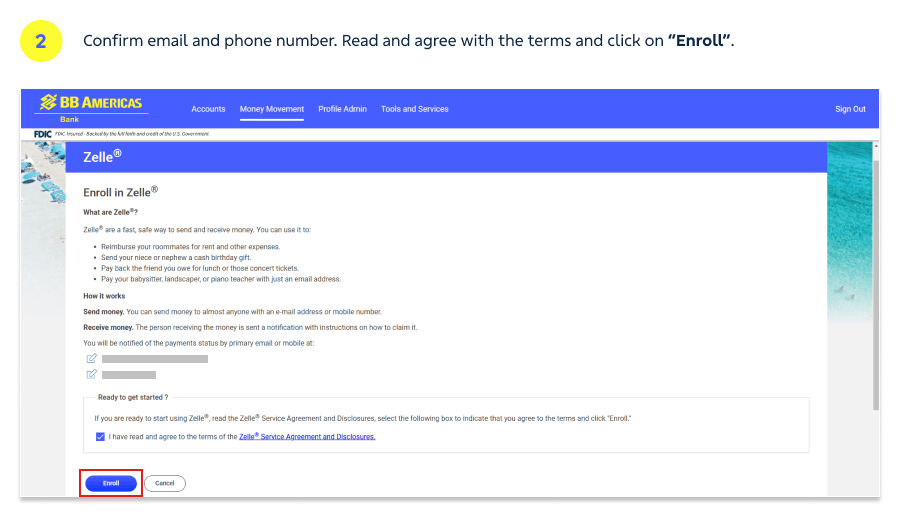 If you’ve never sent money with Zelle®, enroll using an email address or U.S. mobile number.